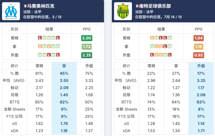 马赛奥林匹克在主场的状态一般,而南特在客场的状态很差。