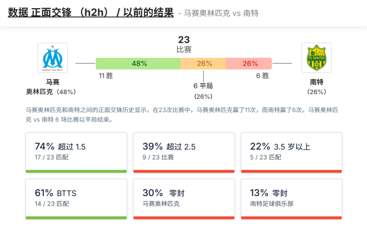 在交锋23次后,马赛奥林匹克赢了11次,而南特赢了6次。6 场比赛以平局告终。